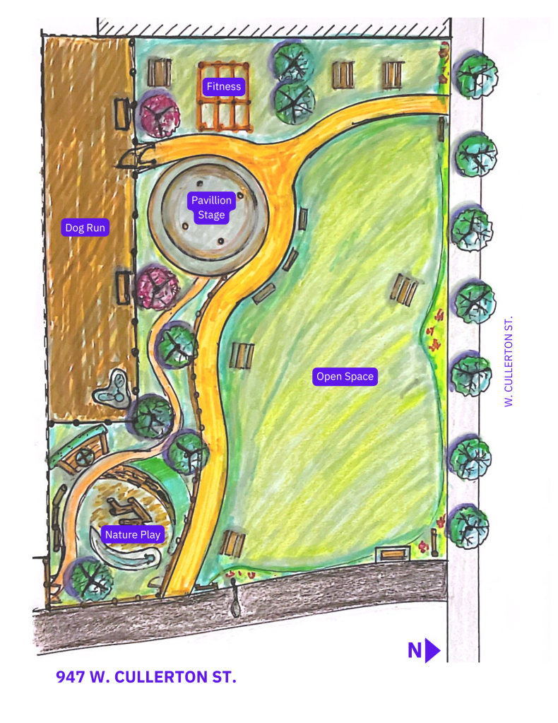 The former site for Loewenthal Metal Smelter, the site was highly contaminated and remediated in 2013 by the Environmental Protection Agency (EPA). Since then the community has used it recreationally and feared the lot would be developed into luxury condos. El Paseo Community Garden and their non-profit land trust, NeighborSpace, expressed interest in preserving the green space on behalf of the community to support the needs and current uses of the site. They would also like to ensure the Sangamon Corridor remains representative of its local identity while being inclusive. The city acquired the parcel in 2020 and then sold it to NeighborSpace. Since then we have been activating the site through an iterative community design process and an evolution of physical activations and testing, including various layouts for the dog run, picnic seating, various community events (wellness programming, Harvest Fest, Market, etc.), Fitness equipment, and Nature Play.
