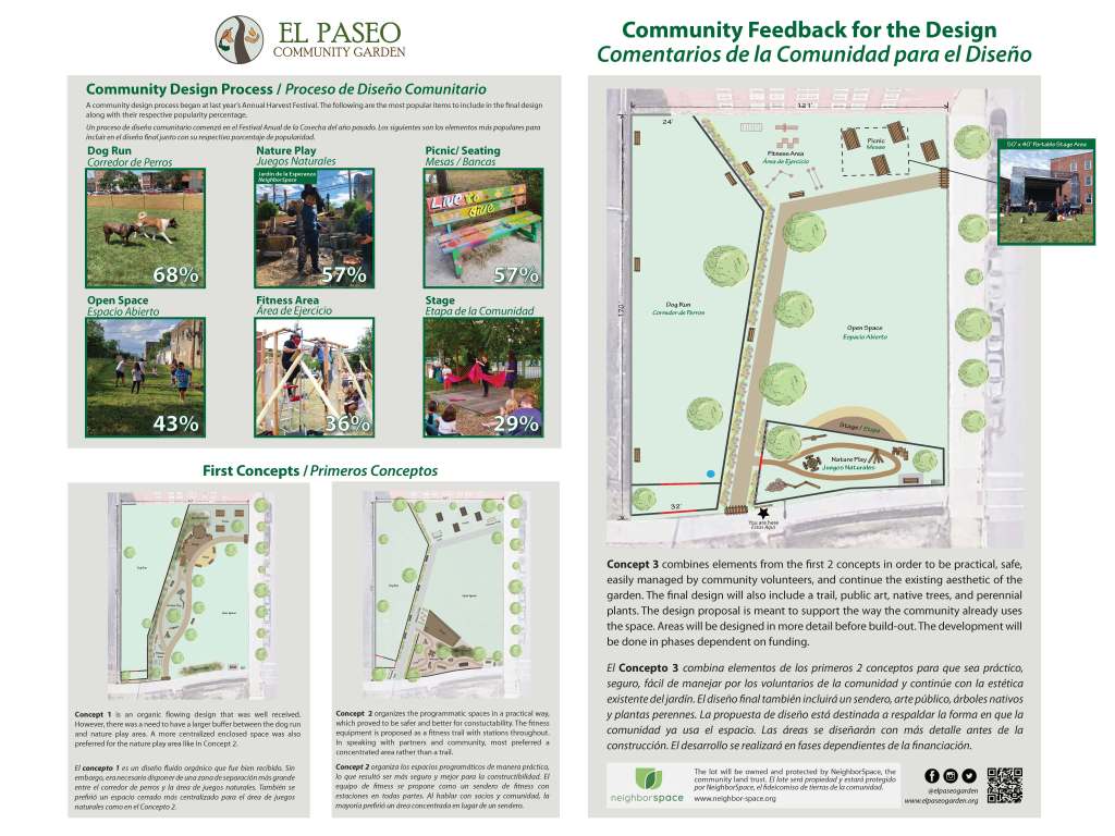 Desde 2020, el jardín comunitario ha mantenido el espacio y comenzó un proceso de diseño comunitario a fines del verano de 2020, el punto álgido de la pandemia. El liderazgo del jardín publicó tableros de diseño para que la comunidad dibuje sus ideas para la expansión. Se proporcionaron mapas para llevar y también se compartieron virtualmente en su sitio web. Aunque se recopilaron muchos comentarios verbalmente con los vecinos del espacio, en el otoño de 2020 se presentaron treinta diseños comunitarios que permitieron al equipo revelar las demandas más altas:
