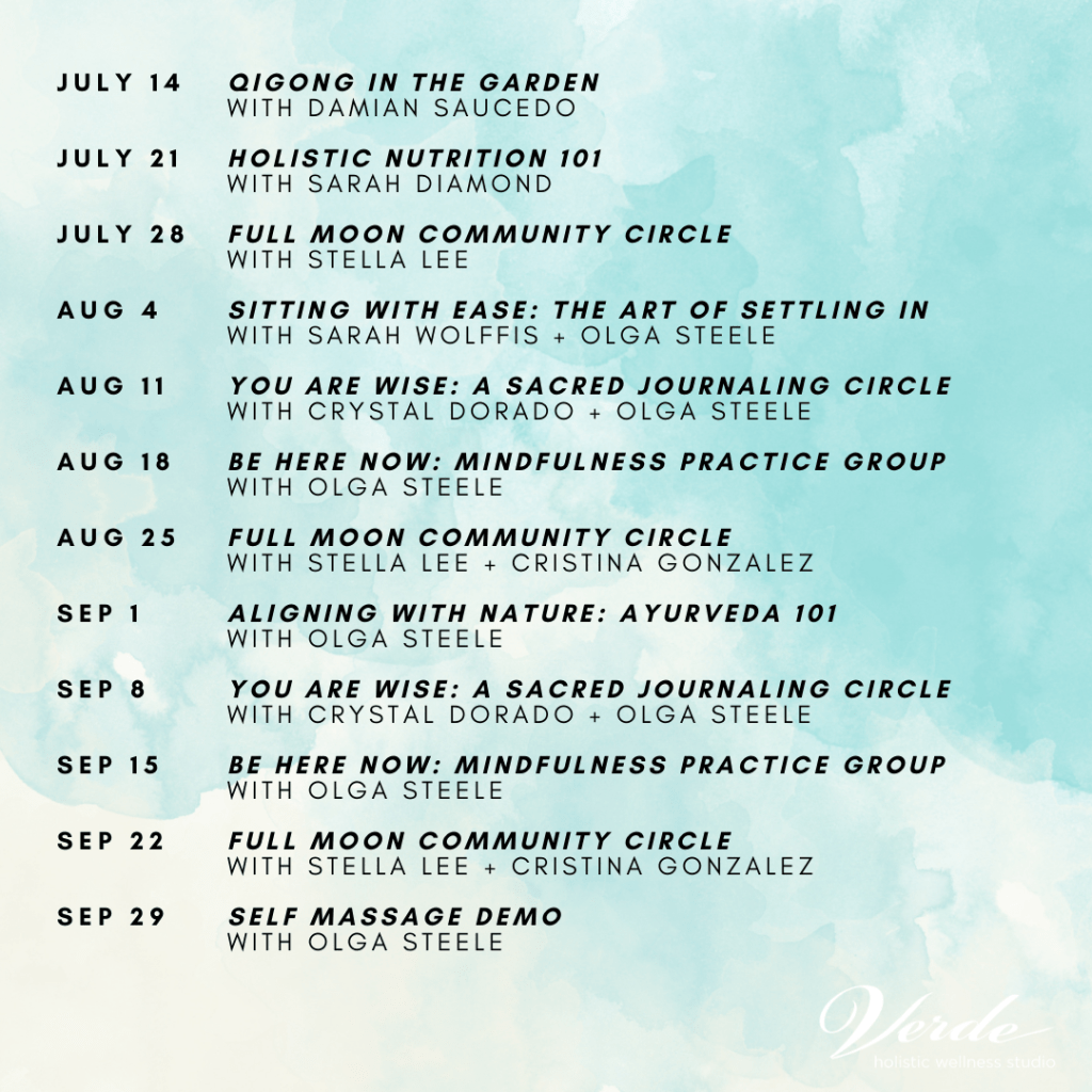 Every week features a different activity that promotes health & well-being, hosted by one of Verde’s talented team of practitioners. From QiGong, to jounaling for your intuition, mindfulness exercises, nutrition workshops, and a Community Full Moon Circle, we hope there’s something for everyone! This series will showcase the many ways Verde is here to help support, and inspire you to build your own unique journey to wholeness and awakened living. Check out the full schedule & mark your calendar for these incredible offerings, brought to you by their talented team of holistic wellness practitioners.